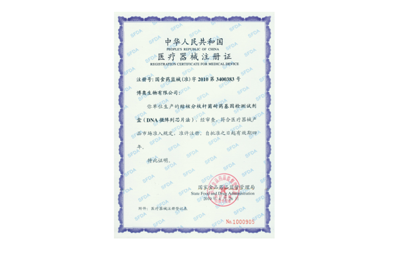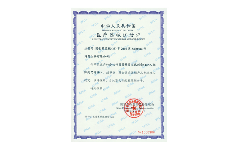 分枝桿菌菌種鑒定試劑盒(DNA微陣列芯片法)獲醫(yī)療器械注冊(cè)證