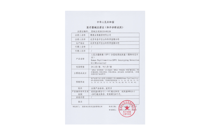 人乳頭瘤病毒(HPV)分型檢測(cè)試劑盒(微陣列芯片法)獲醫(yī)療器械注冊(cè)證