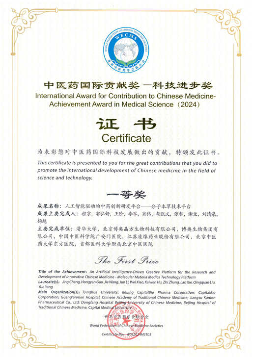 分子本草技術(shù)榮獲中醫(yī)藥國(guó)際貢獻(xiàn)獎(jiǎng)--科技進(jìn)步獎(jiǎng)一等獎(jiǎng)