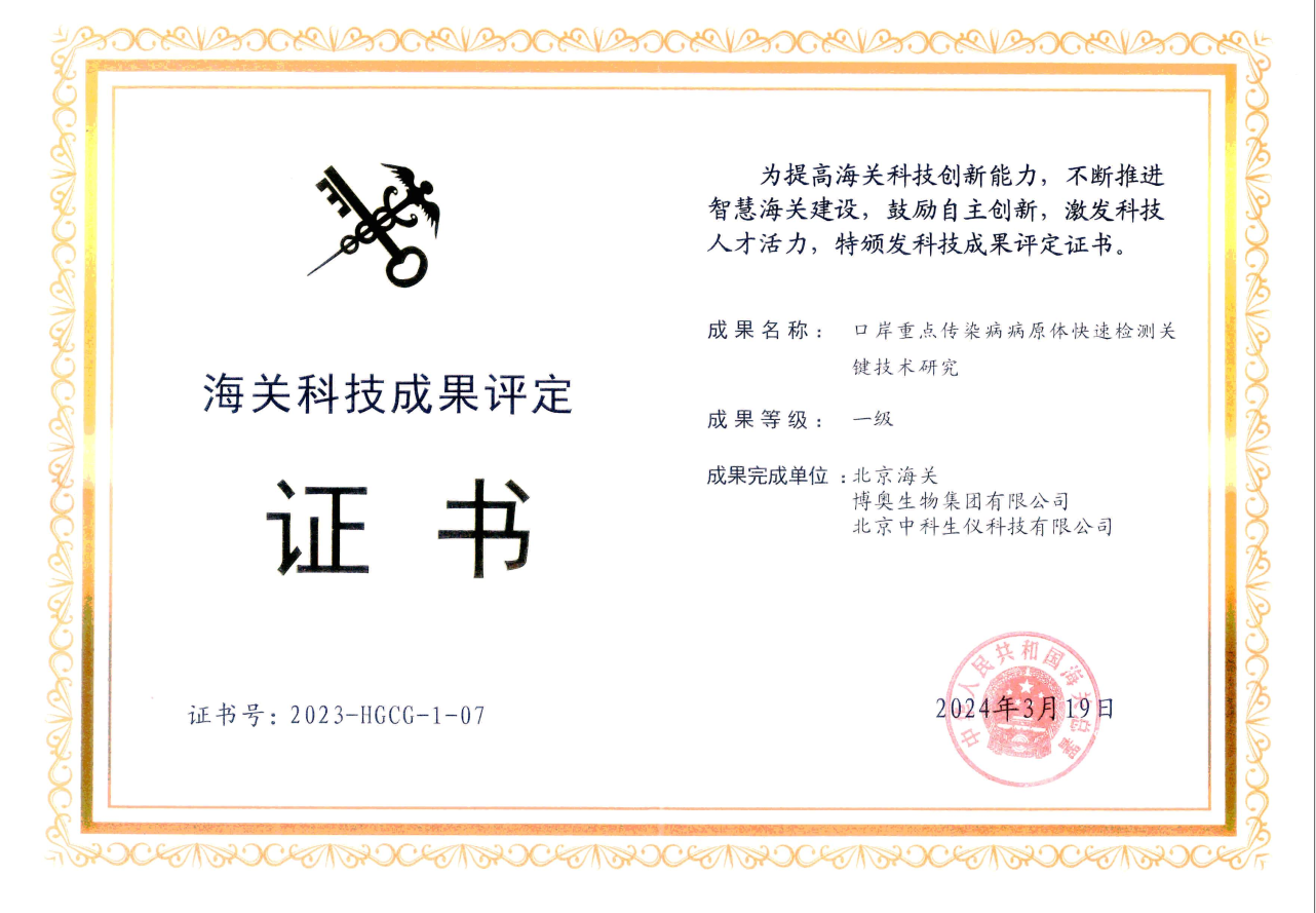 “口岸重點(diǎn)傳染病病原體快速檢測(cè)關(guān)鍵技術(shù)研究項(xiàng)目”獲得中華人民共和國(guó)海關(guān)總署的一等海關(guān)科技成果評(píng)定
