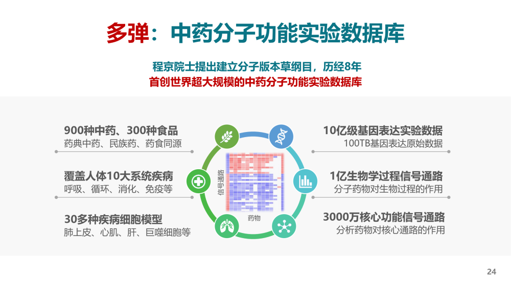 “分子本草技術(shù)是以臨床價(jià)值為導(dǎo)向,通過(guò)解析疾病,分析其中的分子信號(hào)通路變化,然后再以逆轉(zhuǎn)這個(gè)疾病通路為核心,進(jìn)行中藥的功效評(píng)價(jià)和一系列的智能組方?!睏钤奖硎荆骸艾F(xiàn)在這個(gè)數(shù)據(jù)庫(kù)真實(shí)檢測(cè)了900多種中藥、300多種食物提取物對(duì)人體免疫、神經(jīng)、呼吸、循環(huán)等10大系統(tǒng)疾病細(xì)胞模型作用的10億級(jí)真實(shí)基因表達(dá)譜數(shù)據(jù),它所涵蓋的藥物核心作用信號(hào)通路達(dá)到了3000多萬(wàn)條,目前這個(gè)數(shù)據(jù)庫(kù)還在持續(xù)建設(shè)和擴(kuò)展中?!?br />