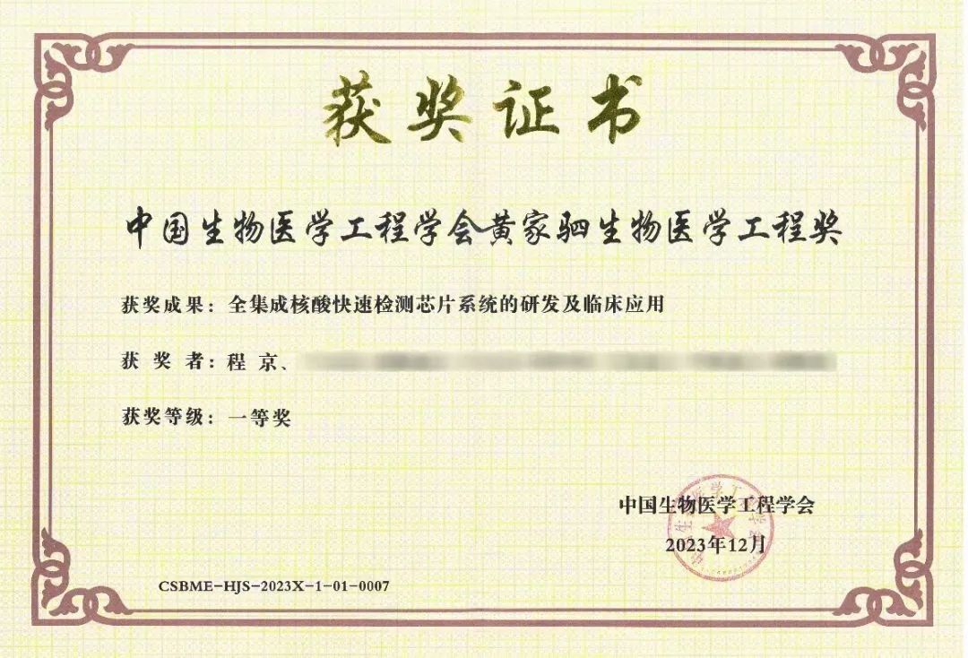 在程京院士帶領(lǐng)和國家重點(diǎn)研發(fā)計(jì)劃支持下,“全集成核酸快速檢測芯片系統(tǒng)的研發(fā)及臨床應(yīng)用”項(xiàng)目突破了一系列關(guān)鍵技術(shù)難題,首創(chuàng)了全集成核酸快速檢測芯片系統(tǒng)。成果達(dá)到“國內(nèi)首創(chuàng)、國際領(lǐng)先”,儀器和芯片試劑盒于2021年通過國家藥監(jiān)局應(yīng)急審批獲Ⅲ類醫(yī)療器械證書,通過歐盟CE認(rèn)證。項(xiàng)目成果被評為“2021年中國醫(yī)藥生物技術(shù)十大進(jìn)展”,并被納入《北京市首臺(套)重大技術(shù)裝備目錄(2021年)》,榮獲CAETS(國際工程院理事會)頒發(fā)的首屆唯一一項(xiàng)“2021 CAETS傳播獎-工程成就獎”。