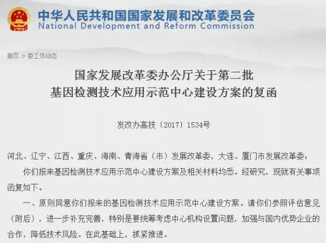2015年6月,國家發(fā)展改革委發(fā)布了《國家發(fā)展改革委關(guān)于實施新興產(chǎn)業(yè)重大工程包的通知》(發(fā)改高技[2015]1303號),將基因檢測技術(shù)應(yīng)用示范中心納入六大重點工程領(lǐng)域之一——“新型健康技術(shù)惠民工程”,支持擁有核心技術(shù)、創(chuàng)新能力和相關(guān)資質(zhì)的機構(gòu),采取網(wǎng)絡(luò)化布局,建設(shè)示范中心,以開展遺傳病和出生缺陷基因篩查為重點,推動基因檢測等先進(jìn)健康技術(shù)普及惠民,引領(lǐng)重大創(chuàng)新成果的產(chǎn)業(yè)化。